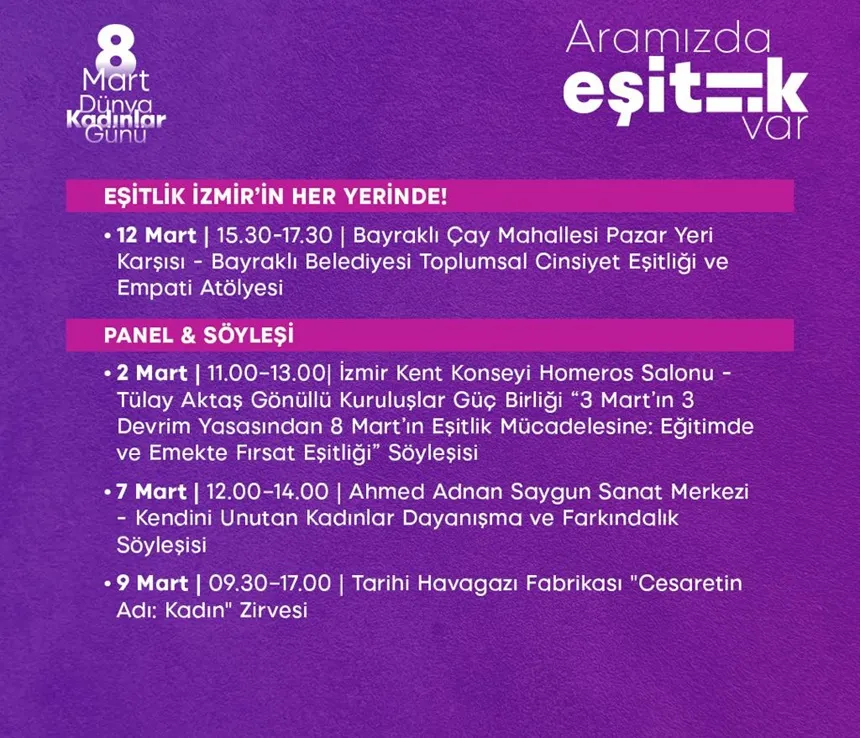 İzmir Büyükşehir Belediyesi, 8 Mart Dünya Kadınlar Günü’nü “Aramızda Eşitlik Var” temasıyla üç gün sürecek etkinliklerle karşılıyor. Kültürpark’tan ilçelere uzanan etkinliklerle kadın emeği ve dayanışma kentin gündeminde olacak. İzmir Büyükşehir Belediyesi, 8 Mart Dünya Kadınlar Günü kapsamında bu yıl "Aramızda Eşitlik Var" temasıyla kentin dört bir yanında kapsamlı bir program hayata geçiriyor. Kültürpark merkezli etkinliklerle emek ve dayanışma yan yana gelirken; kültür, sanat, spor, üretim ve söyleşi buluşmalarıyla 8 Mart’ın eşitlik çağrısı tüm kente yayılıyor. 6–7–8 Mart tarihlerinde Kültürpark’ta gerçekleştirilecek ana programın yanı sıra, farklı ilçelerde düzenlenecek panel, atölye, eğitim ve gösterimlerle İzmir genelinde güçlü bir dayanışma hattı kuruluyor. Kültürpark’ta 3 günlük buluşma Kültürpark’ta 10.00–18.00 saatleri arasında açık olacak stant alanlarında; kadın kooperatiflerinin üretim ve satış stantları, sivil toplum kuruluşlarının tanıtım ve iletişim alanları, İzmir Büyükşehir Belediyesi daire başkanlıklarının bilgilendirme ve atölye çalışmaları, Mobil Hemşehri İletişim Merkezi (HİM) ve Mobil İstihdam Otobüsü İzmirlilerle buluşacak. Ahşap Sahne’de yoga, atölyeler, zumba, bilgi yarışmaları, karaoke, açık sahne müzik performansları ve halk oyunları gösterileri gün boyu devam edecek. 11 Mart’ta ise Çiçekliköy–Belkahve Ata Anı Evi güzergâhında, Medeni Kanun’un 100. yılı kapsamında "100 Kadın ile Farkındalık Doğa Yürüyüşü" düzenlenecek. Kültür, sanat ve sporla dayanışma 8 Mart programı kültür ve sanat etkinlikleriyle de zenginleşiyor. İzmir Sanat’ta tiyatro gösterimleri, Elhamra Sahnesi’nde Lütfi Ömer Akad’ın “Düğün” filmi gösterimi, Tarihi Bıçakçı Han ve kentin farklı noktalarında sergiler, Gençlik Tiyatrosu’nda dans gösterileri, Ahşap Sahne önünde konser programı ile kadın emeği ve üretimi sanatın farklı disiplinlerinde görünür kılınıyor. Spor etkinlikleri kapsamında ise koşu, bisiklet sürüşü, oryantiring parkuru ve kadın futbol müsabakası gerçekleştirilecek. Eşitlik İzmir’in her yerinde Program yalnızca Kültürpark ile sınırlı kalmıyor. Urla’dan Bayraklı’ya, Karşıyaka’dan Dikili’ye, Aliağa’dan Buca’ya kadar birçok ilçede belgesel gösterimleri, toplumsal cinsiyet eşitliği eğitimleri, iklim krizi ve afetler bağlamında eşitlik atölyeleri, söyleşi ve paneller düzenlenerek 8 Mart’ın mesajı kent geneline taşınıyor. Ayrıca İzmir Kent Konseyi, Ahmed Adnan Saygun Sanat Merkezi ve Tarihi Havagazı Fabrikası gibi önemli mekânlarda gerçekleştirilecek panel ve zirvelerle eşitlik mücadelesi düşünsel zeminde de ele alınıyor. İzmirlilere davet İzmir Büyükşehir Belediyesi, kadınların emeğini görünür kılmayı, kamusal alanda eşit ve özgür katılımı güçlendirmeyi ve dayanışma kültürünü yaygınlaştırmayı temel bir yerel yönetim sorumluluğu olarak görüyor. Büyükşehir Belediyesi, bu kapsamda tüm İzmirlileri 6–7–8 Mart tarihlerinde Kültürpark’ta ve kent genelinde düzenlenecek etkinliklerde eşitliğin ve dayanışmanın bir parçası olmaya davet ediyor. |