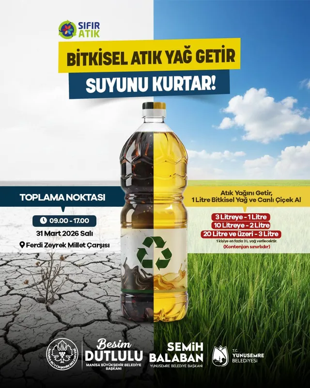 Manisa Büyükşehir ve Yunusemre Belediyeleri, evsel bitkisel atık yağları toplayarak hem çevreyi koruyacak hem de vatandaşları yeni yağ ve çiçekle ödüllendirecek bir kampanya başlattı. Kampanya, 31 Mart 2026'da Ferdi Zeyrek Millet