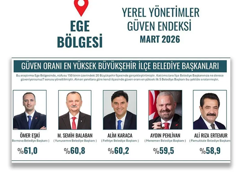 ORC Araştırma Şirketi tarafından 27 Şubat-4 Mart 2026 tarihleri arasında Ege Bölgesi'ndeki 20 ilçede 7 bin 200 katılımcı ile gerçekleştirilen çalışmada vatandaşlara, "İlçe Belediye Başkanınıza ne derece güveniyorsunuz?" sorusu yöneltildi. Araştırma sonucunda Pamukkale Belediye Başkanı Ali Rıza Ertemur, yüzde 58,9'luk güven oranıyla listenin ilk 5 sırasında yer aldı.