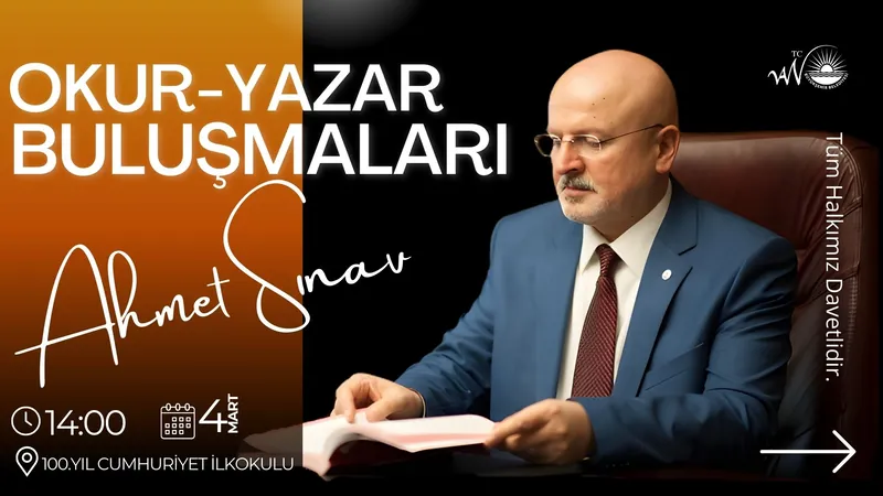 4 Mart Çarşamba günü saat 14.00'te 100. Yıl Cumhuriyet İlkokulu'nda gerçekleşecek etkinlikte Yazar Ahmet Sınav, yazarlık serüvenini ve eserlerini katılımcılarla paylaşacak. Sınav, ayrıca soru-cevap bölümünde okurlarıyla sohbet edecek.