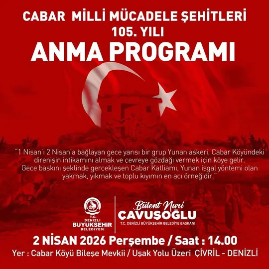Denizli Büyükşehir Belediyesi, Yunan işgal güçlerinin 1921'de Çivril'in Cabar köyünde gerçekleştirdiği ve 83 sivilin hayatını kaybettiği katliamın 105. yıl dönümünde anma programı hazırladı.