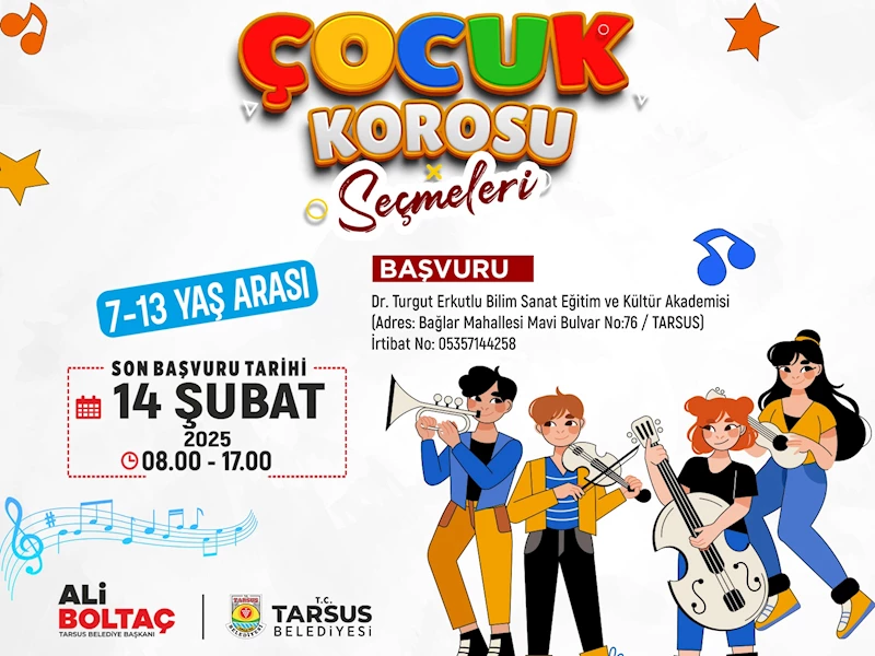 Sanatın toplum üzerindeki birleştirici ve geliştirici gücüne önem veren Tarsus Belediyesi, çocukların müziğe olan ilgisini artırmak ve onları sanatsal bir ortamda bir araya getirmek amacıyla Çocuk Korosu seçmeleri düzenliyor.   Koro, yetenekli çocuklara profesyonel bir ortamda eğitim alma fırsatı sunacak.  Başvuru yapmak isteyenler Dr. Turgut Erkutlu Bilim Sanat Eğitim ve Kültür Akademisi'nde kayıt yaptırabilecek.