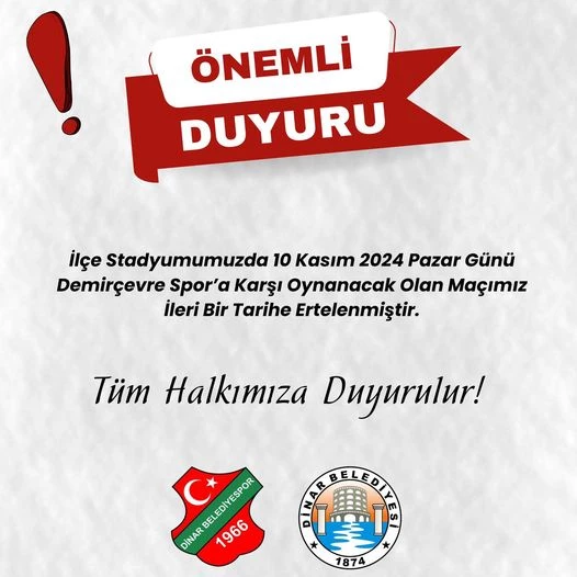 10 Kasım 2024 Pazar Günü Demirçevre Spor’a Karşı Oynanacak Olan Maçımız İleri Bir Tarihe Alınmıştır.