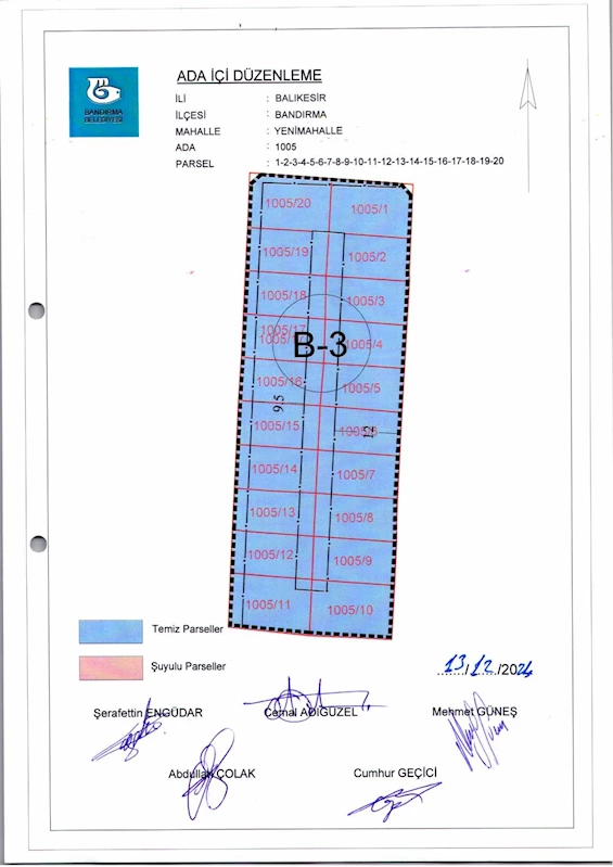 Belediye Encümeninin 18.12.2024 tarih ve 1229 sayılı Encümen kararı ile 100. Yıl Mahallesi, 1005 ada 1-2-3-4-5-6-7-8-9-10-11-12-13-14-15-16-17-18-19-20 nolu parsellere ait ada içi düzenlemesinin, 1/1000 ölçekli Bandırma Uygulama İmar Planı notlarının 137. Maddesi ve 3194 sayılı İmar Kanununun 19. maddesi gereği onaylanmasına,