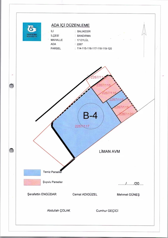 Belediye Encümeninin 18.12.2024 tarih ve 1234 sayılı Encümen kararı ile 17 Eylül Mahallesi, 2267 ada 114, 115, 116, 117, 118, 119 120 nolu parsellere ait ada içi düzenlemesinin, 1/1000 ölçekli Bandırma Uygulama İmar Planı notlarının 137. Maddesi ve 3194 sayılı İmar Kanununun 19. maddesi gereği onaylanmasına,