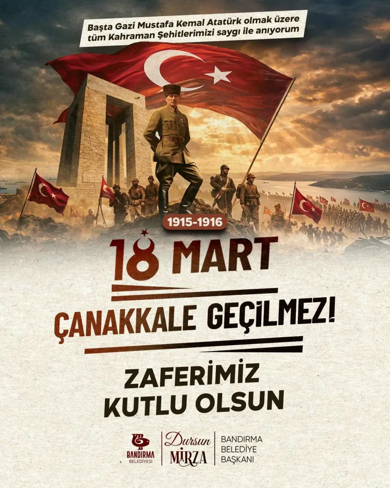 Bandırma Belediyesi, Çanakkale Zaferi'nin 111. yıl dönümünü gururla andı. Zaferin, milletin birlik ruhunun simgesi olduğu ve Gazi Mustafa Kemal Atatürk'ün liderliğinin altı çizildi.