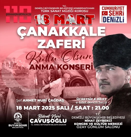 Denizli Büyükşehir Belediyesi, Çanakkale Zaferi’nin 110. yıl dönümünü anlamlı bir etkinlikle kutlamaya hazırlanıyor. Denizli Büyükşehir Belediyesi Konservatuvarı Türk Sanat Müziği Korosu tarafından düzenlenecek olan "18 Mart Çanakkale Zaferi Anma Konseri" vatandaşlarla buluşacak. Çanakkale Zaferi'nin destansı mücadelesinin Türk Sanat Müziği ile birleşeceği konser Şef Ahmet Nuri Çağdaş yönetiminde sahnelenecek. Konser 18 Mart Salı günü saat 21.00’de Nihat Zeybekci Kongre ve Kültür Merkezi Özay Gönlüm Salonu’nda ücretsiz olarak düzenlenecek. Etkinliğe katılarak Çanakkale Zaferi ruhuna tanıklık etmek isteyen vatandaşlar biletlerini "e-bilet.denizli.bel.tr" adresinden temin edilebilecek.