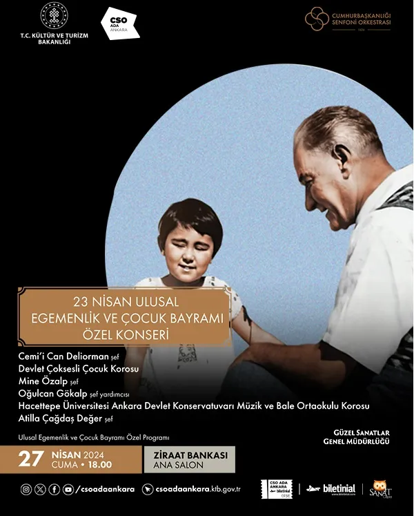 Cumhurbaşkanlığı Senfoni Orkestrası, 23 Nisan Ulusal Egemenlik ve Çocuk Bayramı dolayısıyla, 27 Nisan Cumartesi saat 18:00’de CSO Ada Ankara Ziraat Bankası Ana Salon’da özel bir konser verecek. Şef Cemi’i Can Deliorman yönetiminde, çocuk korolarının katılımıyla gerçekleştirilecek konser, minik sanatseverlerin beğenisine sunulacak.