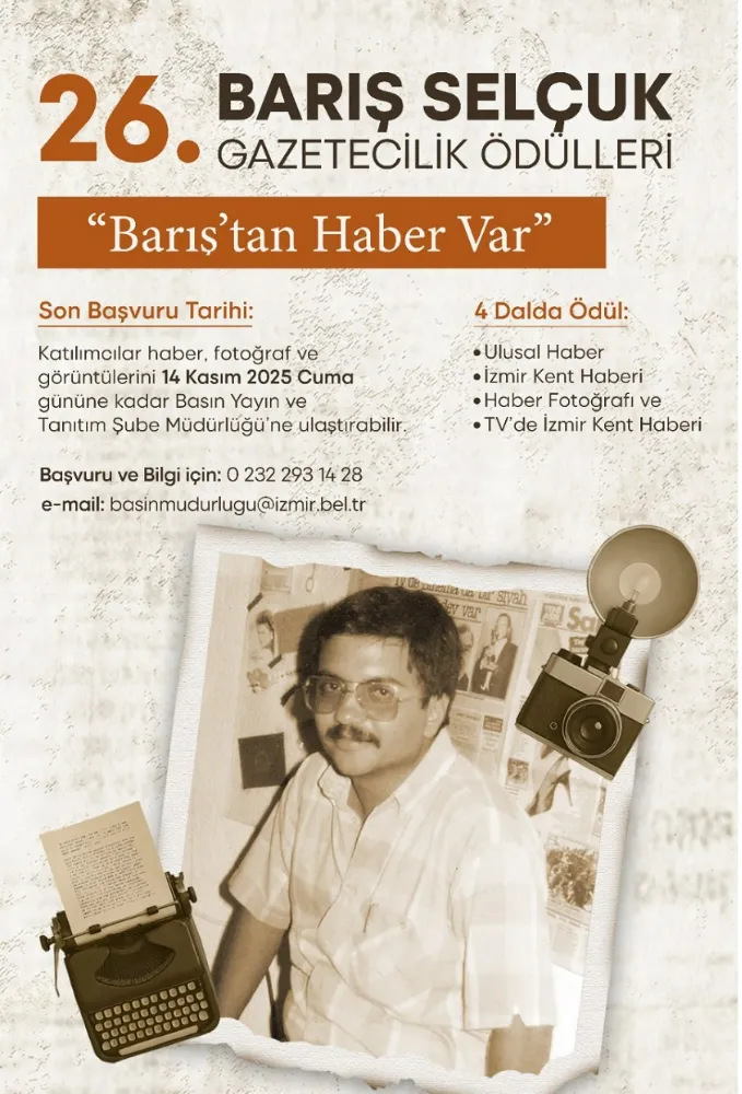 İzmir Büyükşehir Belediyesi tarafından 26’ncısı düzenlenen Barış Selçuk Gazetecilik Yarışması için başvurular sürüyor. Barış Selçuk’un anısını yaşatmak ve genç gazetecileri teşvik etmek amacıyla düzenlenen Barış Selçuk Gazetecilik Ödülleri Yarışması’nda katılımcılar haber, fotoğraf ve görüntülerini, 14 Kasım 2025 Cuma gününe kadar İzmir Büyükşehir Belediyesi Basın Yayın ve Tanıtım Şube Müdürlüğü’ne ulaştırabilecek.