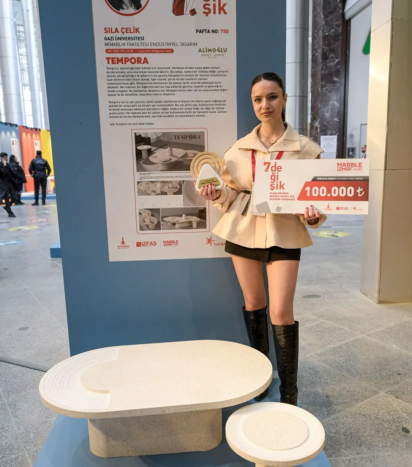 Gazi Üniversitesi Endüstriyel Tasarım Bölümü dördüncü sınıf öğrencisi Sıla Çelik, saat dilimlerinden ilham alarak, çeyrek, yarım ve tam saatlerin zamanı somutlaştırdığı üç parçalık sehpadan oluşan Tempora projesiyle ikinci oldu. 100 bin liralık ödülün sahibi olan Sıla Çelik de çok heyecanlandığını belirterek, “Tasarımımın doğal taş ile buluşması doğal taşa ilgimi daha çok artırdı. Bu alanda kendimi geliştirmeyi düşünüyorum. Son sınıf öğrencisi olduğum için iş hayatıma başlarken referans olarak bana çok fayda sağlayacak bir yarışma ve derece oldu. Çok heyecanlıyım, kendimi çok daha cesaretli hissediyorum” dedi.