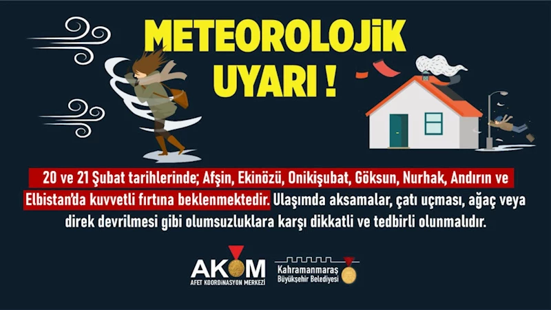Afet Koordinasyon Merkezi, 20 ve 21 Şubat tarihlerinde Afşin, Ekinözü, Onikişubat, Göksun, Nurhak, Andırın ve Elbistan ilçelerinde kuvvetli fırtınanın etkili olacağını duyurarak dikkatli ve tedbirli olunması noktasında vatandaşları uyardı.