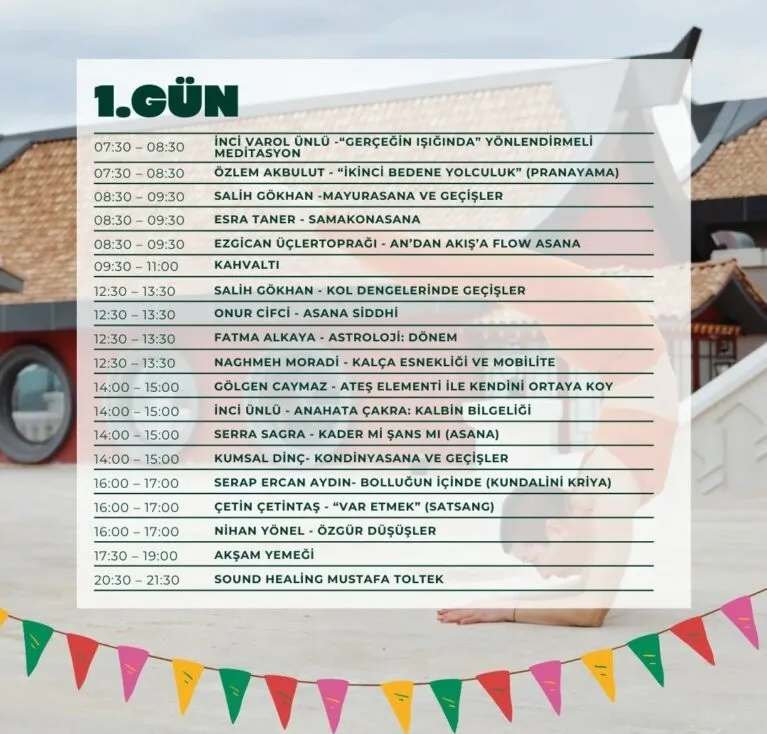 Her seviyeye uygun dersler içeren festival; çeşitli yoga dersleri, meditasyon oturumları, nefes çalışmaları ve ruhsal gelişim atölyeleri gibi zengin etkinliklerle dolu olacak. Ayrıca, yoga ustaları ve öğretmenleri tarafından verilecek ilham verici konuşmalar, katılımcıların yoga yolculuklarını derinleştirmelerine yardımcı olacak.