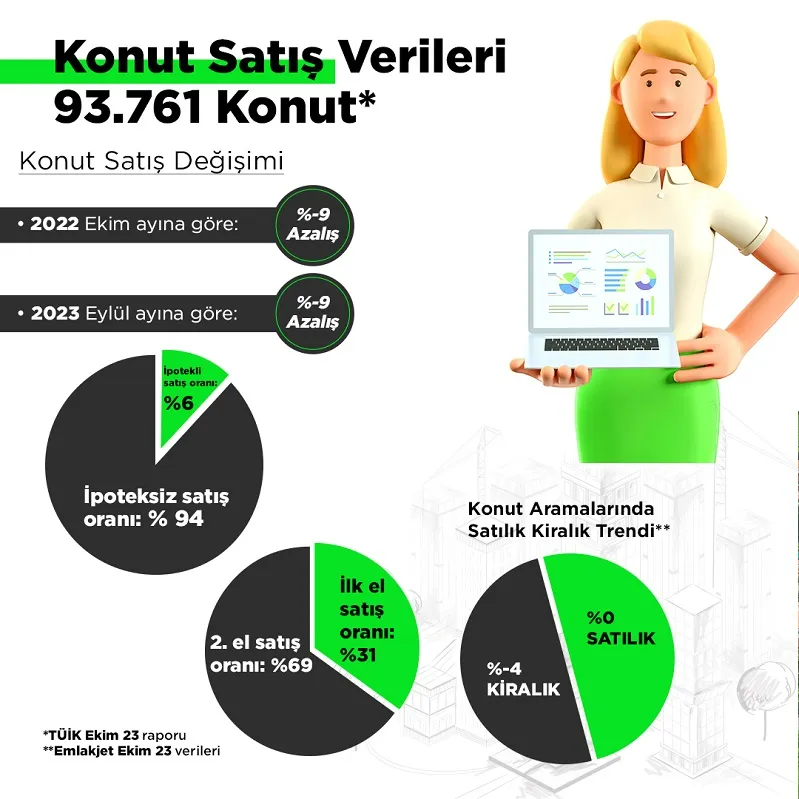 TÜİK verilerine göre Türkiye genelinde konut satışları ekim ayında bir önceki yılın Ekim ayına göre yüzde 8,7 azalarak 93 bin 761 olurken, Ocak-Ekim döneminde bir önceki yılın aynı dönemine göre 14,3 azalışla 993 bin 835 olarak gerçekleşti. Türkiye genelinde ipotekli konut satışları ekim ayında bir önceki yılın aynı ayına göre yüzde 58 azalış göstererek 5 bin 577 oldu. Toplam konut satışları içinde ipotekli satışların payı yüzde 5,9 olarak gerçekleşti.
