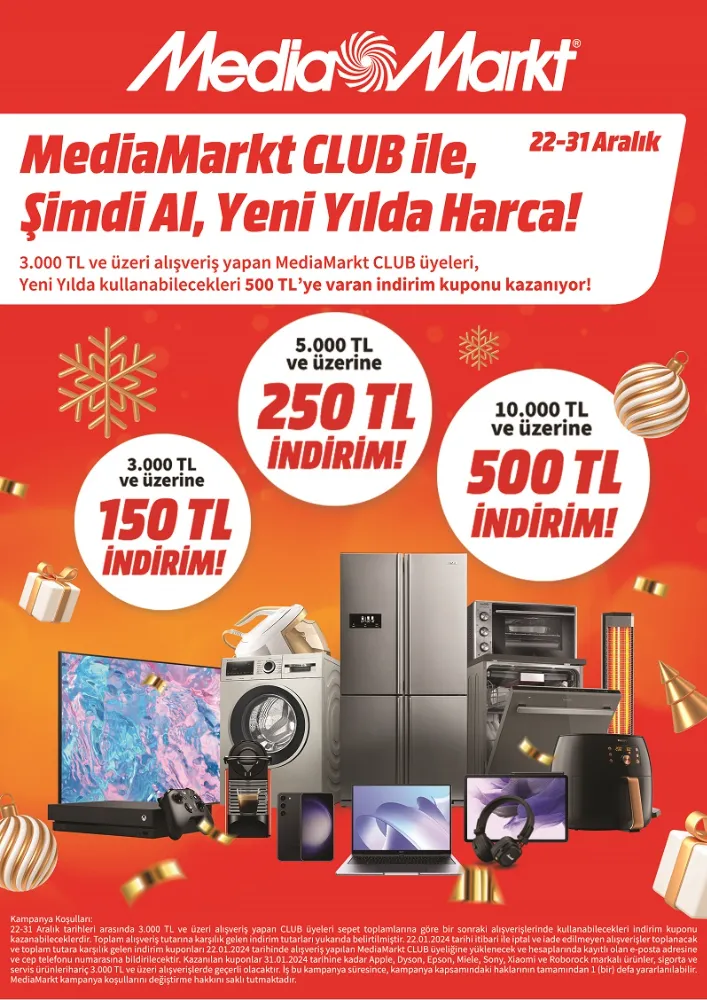 Kampanya, MediaMarkt mağazalarında, mediamarkt.com.tr ya da MediaMarkt mobil uygulamasından 22 - 31 Aralık 2023 tarihleri arasında yapılan alışverişlerde geçerli olacak. İndirim kuponu kazanan MediaMarkt CLUB üyeleri, 22-31 Ocak 2024 tarihlerinde kuponlarını kullanabilecek.