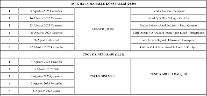 Pendiklilerin yaz aylarını dolu dolu geçirmesi için kültürel ve sosyal etkinlikler düzenlemeyi sürdüren Pendik Belediyesi, ağustos ayında sinema geceleri, tiyatrolar ve konser programları hazırladı. Sinema ve tiyatrolar Pendik Millet Bahçesi’nde; konserler ise mahallelerde gerçekleşecek. Etkinlikler kapsamında Pendik Millet Bahçesi’nde ilk kez açık hava tiyatrosu düzenlenecek.