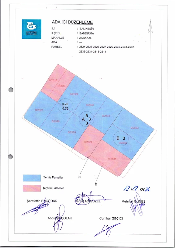 Belediye Encümeninin 18.12.2024 tarih ve 1235 sayılı Encümen kararı ile Aksakal Mahallesi, 2524, 2525, 2526, 2527, 2529, 2530, 2531, 2532, 2533, 2534, 2813, 2814 nolu parsellere ait ada içi düzenlemesinin, 1/1000 ölçekli Bandırma Uygulama İmar Planı notlarının 137. Maddesi ve 3194 sayılı İmar Kanununun 19. maddesi gereği onaylanmasına,