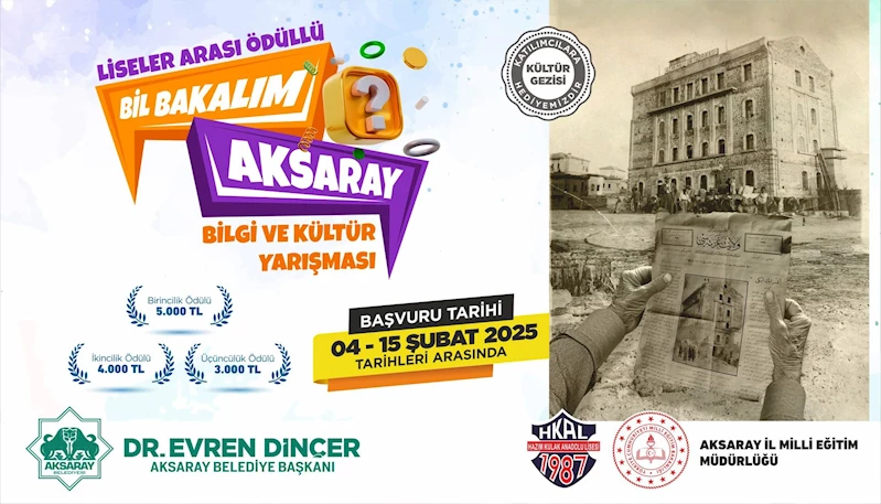 Aksaray Belediye Başkanı Dr. Evren Dinçer, yarışmanın gençlerin kültürel ve akademik gelişimine katkı sağlayacağını belirterek, “Gençlerimizin bilgi birikimini artırmak ve şehrimizin kültürel değerlerini daha yakından tanımalarını sağlamak adına bu yarışmayı düzenliyoruz. Bu organizasyon sayesinde öğrencilerimiz hem kıyasıya bir rekabetin içinde olacak hem de Aksaray’ın tarihi ve kültürel mirasını keşfedecekler. Tüm liseli gençlerimizi bu yarışmaya katılmaya davet ediyorum.” ifadelerini kullandı.
