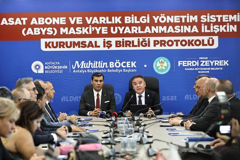 Antalya Büyükşehir Belediyesi ASAT Genel Müdürlüğü ALDAŞ Teknoloji Ofisi tarafından geliştirilen ASAT Abone ve Varlık Bilgi Yönetim Sistemi’nin Manisa Büyükşehir Belediyesi Manisa Su ve Kanalizasyon İdaresi’ne (MASKİ) uyarlanmasına yönelik kurumsal işbirliği protokolü düzenlendi. ASAT Genel Müdürlüğü’nde düzenlenen törene Antalya Büyükşehir Belediye Başkanı Muhittin Böcek, Manisa Büyükşehir Belediye Başkanı Ferdi Zeyrek, Manisa Büyükşehir Belediyesi Genel Sekreteri Burak Deste, ASAT Genel Müdürü İbrahim Kurt, ALDAŞ Genel Müdürü Kıvanç Kuzay ve MASKİ Genel Müdürü Talat Postacı katıldı. İmza töreninde konuşan Başkan Muhittin Böcek, dijital dönüşüme sadece iş dünyasının değil, kamusal alanda yerel yönetimlerin de ayak uydurması gerektiğini belirterek, bunun hizmet kalitesi, zaman yönetimi, işgücü, tasarruf gibi konularda avantaj sağlaması açısından son derece önemli olduğunu ifade etti.