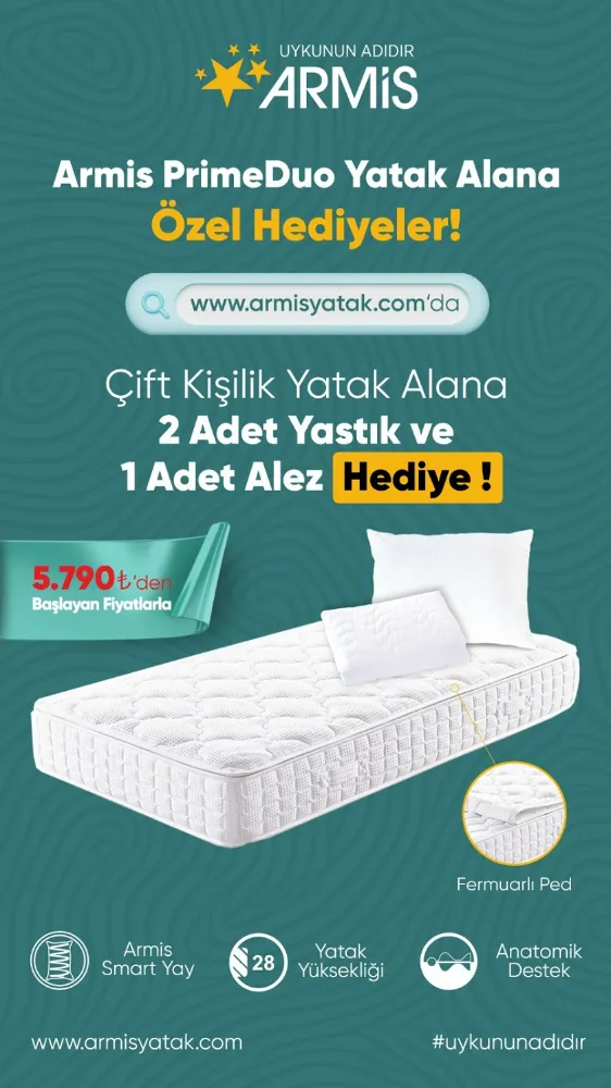 Yenilikçi ve inovatif ürünleriyle doğa ve kullanıcı dostu olan Armis Yatak, kampanyalı ürünleriyle her bütçeye hitap ediyor. Armis’in çevre dostu tasarımı ve üstün uyku konforunu bir araya getiren Armis Prime Duo modeli, şimdi sadece armisyatak.com’a özel bir kampanya ile kullanıcılarla buluşuyor. Kampanya kapsamında çift kişilik Prime Duo yatak alanlara 2 adet yastık ve 1 adet alez hediye ediliyor.