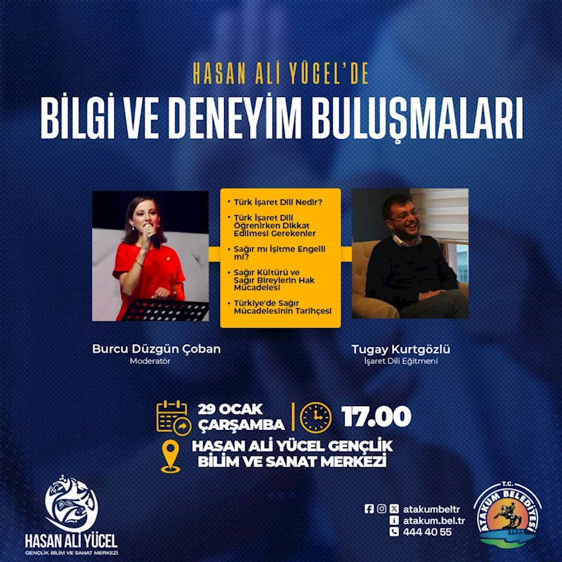 Atakum Belediyesi, Hasan Ali Yücel Gençlik Bilim ve Sanat Merkezinde düzenlediği bilgi ve deneyim buluşmalarında, her hafta farklı bir uzmanı vatandaşlarla buluşturuyor. Bu hafta Atakum Belediyesi İşaret Dili Eğitmeni Tugay Kurtgözlü’nün konuk olacağı programda, Türk İşaret Dilinin yaygınlaştırılması için yapılacak çalışmalar ele alınacak. İşaret Dili Eğitmeni Kurtgözlü, ‘Türk İşaret Dili Nedir?’, ‘Türk İşaret Dili Öğrenirken Dikkat Edilmesi Gerekenler’, ‘Sağır mı İşitme Engelli mi’, ‘Sağır Kültürü ve Sağır Bireylerin Hak Mücadelesi’ ile ‘Türkiye’de Sağır Mücadelesinin Tarihçesi’ başlıkları altında önemli bilgiler verecek. Burcu Düzgün Çoban’ın moderatörlüğünü yapacağı program, 29 Ocak Çarşamba günü saat 17.00’de başlayacak.