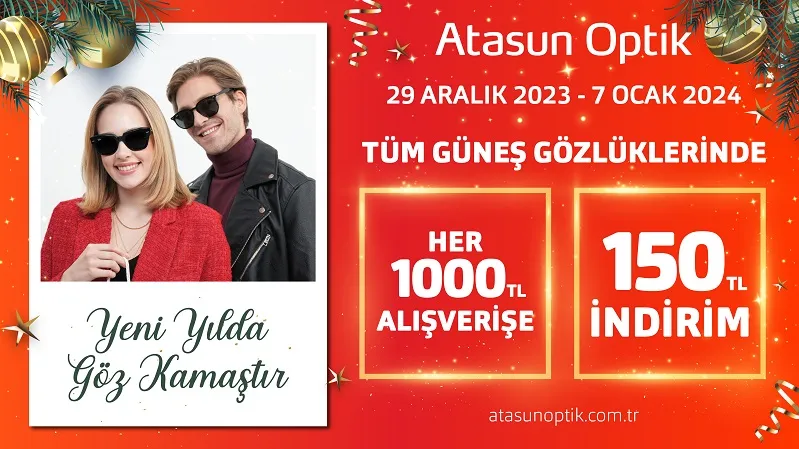 Atasun Optik, 2024’ü “Yeni Yılda Göz Kamaştır” kampanyası ile karşılıyor. Her 1000 TL değerindeki güneş gözlüğü alışverişinde 150 TL indirim kampanyası, 29 Aralık 2023 - 7 Ocak 2024 tarihleri arasında geçerli olacak.