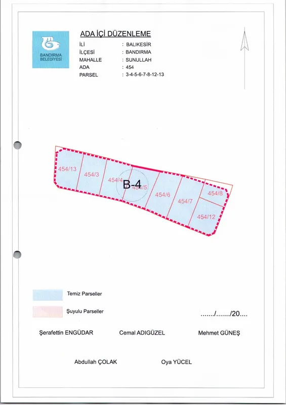 Bandırma Belediyesi Encümeni, 17 Aralık 2025 tarihli ve 1430 sayılı kararı ile Sunullah Mahallesi'nde bulunan 454 ada içindeki 3, 4, 5, 6, 7, 8, 12 ve 13 numaralı parsellere ait ada içi düzenleme planının onaylanmasına karar verdi.