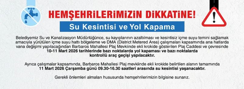 Çanakkale Belediyesi Su ve Kanalizasyon Müdürlüğü, su kayıplarının azaltılması ve kesintisiz içme suyu temini amacıyla yürütülen çalışmalar kapsamında ana hatlarda vana değişimi yapacak. Bu kapsamda Barbaros Mahallesi Plaj Mevkiinde, Plaj Caddesi ve çevresinde 10-11 Mart 2026 tarihlerinde bazı noktalarda yol kapaması, bazı noktalarda ise kontrollü araç geçişi uygulanacak.