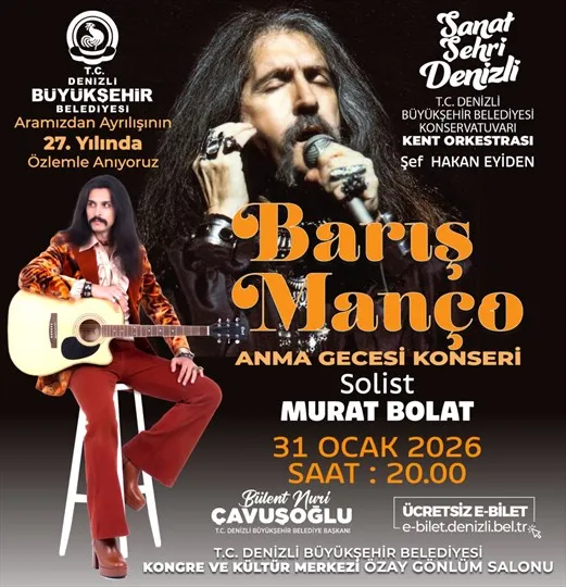 Türk müziğinin efsane ismi Barış Manço, aramızdan ayrılışının 27. yılında düzenlenecek özel bir konserle anılacak. 31 Ocak 2026 Cumartesi günü ücretsiz olarak gerçekleştirilecek anma konserine tüm Denizlililer davet edildi.