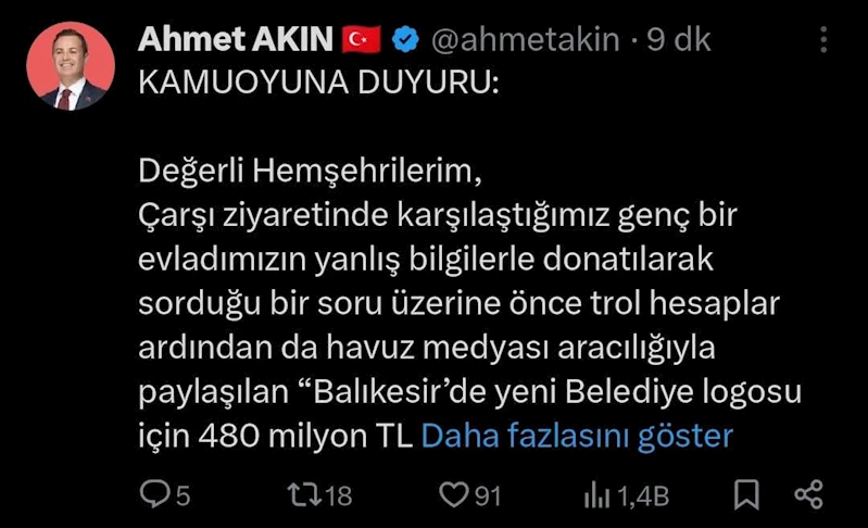 Balıkesir Büyükşehir Belediye Başkanı Ahmet Akın, çarşı ziyaretinde karşılaştığı bir gencin yanlış bilgilerle etki altında kalarak sorduğu soru üzerine; trol hesaplar ve havuz medyası tarafından iftiralarla karşı karşıya geldi. “Balıkesir’de yeni Belediye logosu için 480 milyon TL harcandı” başlıklı mesnetsiz ve iftira içerikli yayınlarla ilgili olarak açıklama yapan Başkan Akın, bu yalan ve iftiraların kendisini yıpratmayacağını aksine Balıkesir’in güzel insanları için çalışma şevkine güç katacağını; iftirayı atanlar hakkında ise derhal hukuki süreci başlatacağını ifade etti.