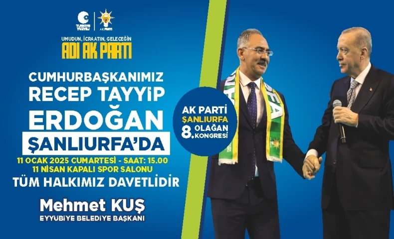 Başkan Kuş, AK Parti Genel Başkanı ve Cumhurbaşkanı Recep Tayyip Erdoğan’ın, yarın saat 15.00’te 11 Nisan Spor Salonu’nda düzenlenecek olan AK Parti Şanlıurfa 8. Olağan Kongresi’ne katılmak üzere Şanlıurfa’da olacağını hatırlatarak, tüm Şanlıurfalıları kongreye davet etti.