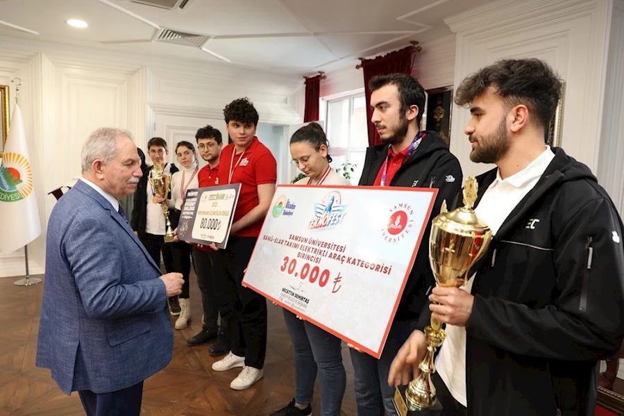 Başkanlık makamında gerçekleşen ziyarette TEKNOFEST yarışmasında desteklenen Yüksek İrtifa Kategorisinde ikinci olan “Samsun Roket Takımına” 20 bin TL ödülü, Elektrikli Araçlar Kategorisinde birinci olan Samsun Üniversitesi (SAMÜ-ELAR) takımına 30 bin TL’lik çeki Başkan Demirtaş takdim etti.