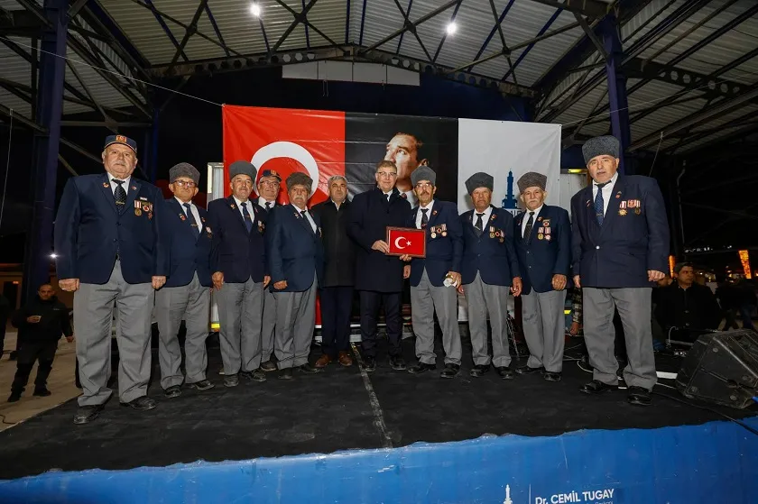 Konuşmaların ardından gaziler Başkan Tugay’a verdiği hizmetler nedeniyle günün anısına Türk bayrağı armağan etti.