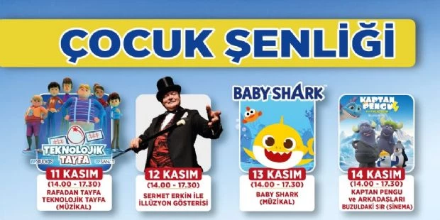 Belediyemiz, çocukların ara tatillerini eğlenceli bir şekilde geçirmeleri için 11-15 Kasım tarihleri arasında ‘Çocuk Şenliği’ etkinliği düzenliyor. Şahinbey Kongre ve Sanat Merkezi’nde düzenlenecek olan ‘Çocuk Şenliği’ 11 Kasım günü saat 09.00’da kapılarını açacak. 11-15 Kasım tarihleri arasında 09.00 ve 19.00 saatleri arasında düzenlenecek etkinliklerde Rafadan Tayfa Teknolojik Tayfa, Sermet Erkin ile İllüzyon Gösterisi, Baby Shark, Kaptan Pengu ve Arkadaşları, Kral Şakir, Survıvor Parkuru, Transformers ve Masal Ağacı çocuklarla buluşacak.