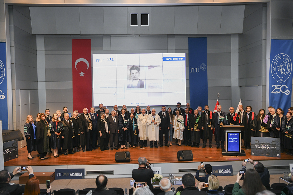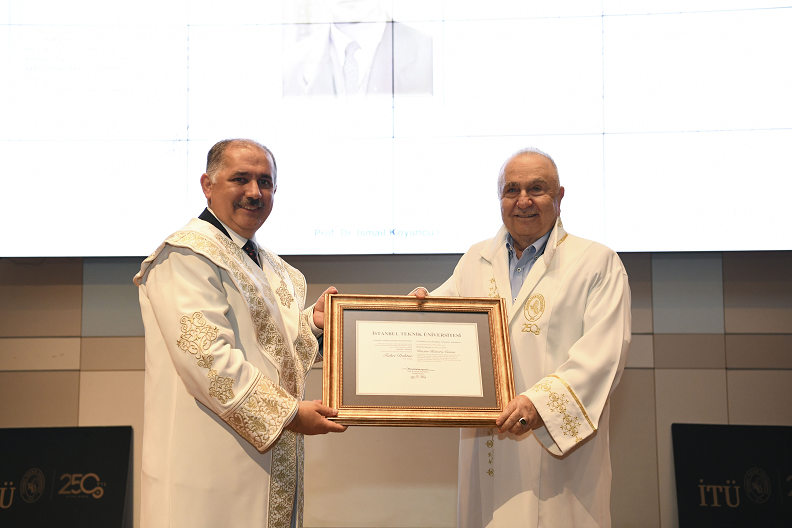 Konuşmasının ardından Prof. Dr. Koyuncu, İTÜ Senatosu tarafından alınan karar gereği “Ülkemizde raylı sistemler, trafik, deniz taşımacılığı, çevre kirliliğinin önlenmesi, şehircilik ve eğitim gibi alanlarda yaptığı öncü ve nitelikli çalışmalar nedeniyle” verilen Fahri Doktora diplomasını Bedrettin Dalan’a takdim etti.