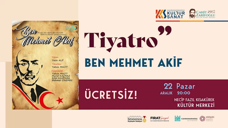 Kahramanmaraş Büyükşehir Belediyesi, kültür ve sanat faaliyetlerine hız kesmeden devam ediyor. Cahit Zarifoğlu Kültür Sanat Sezonu kapsamında düzenlenen etkinlikler, her yaştan vatandaşın ilgisini çekerken, bu kez anlamlı bir tiyatro gösterisi sahne alacak. 22 Aralık Pazar günü, Necip Fazıl Kısakürek Kültür Merkezi’nde “Ben Mehmet Akif” adlı yetişkin tiyatrosu izleyicilerle buluşacak. Saat 20.00’da başlayacak olan etkinlik, İstiklal Şairi Mehmet Akif Ersoy’un hayatını, mücadelesini ve fikir dünyasını sahneye taşıyacak.