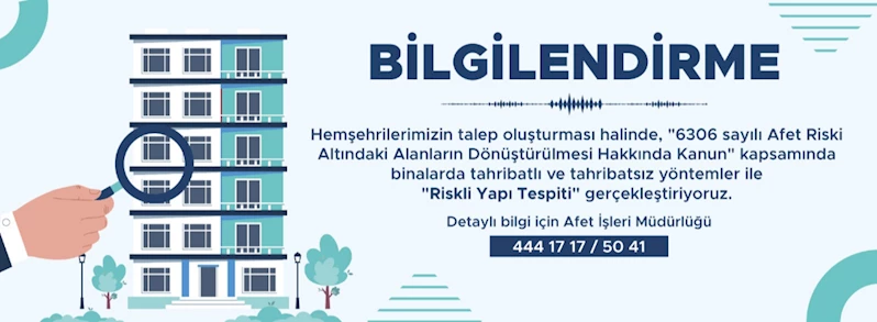 Hemşehrilerimizin talep oluşturması halinde, “6306 sayılı Afet Riski Altındaki Alanların Dönüştürülmesi Hakkında Kanun” kapsamında binalarda tahribatlı ve tahribatsız yöntemler ile “Riskli Yapı Tespiti” gerçekleştiriyoruz.