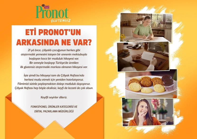Türkiye’de üretilen ilk glutensiz atıştırmalık markası olan ETi Pronot’un yeni reklam filmi tüketicilerle buluştu. 21 yıl önce çölyaklı çocuğu için bir annenin yazdığı mektupla başlayan ETi Pronot’un hikayesinin anlatıldığı reklam filminde “Glutensiz hayatın eksiği yok; keyfi de lezzeti de çok!” mottosuyla da Eti Pronot’un glutensiz yaşama lezzet kattığı vurgulanıyor.