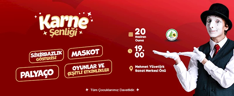 Etkinlik, 20 Haziran Cuma günü saat 19.00’da Mehmet Yücetürk Sanat Merkezi önünde gerçekleştirilecek. Programda sihirbazlık, maskot ve palyaço gösterilerinin yanı sıra eğlenceli oyunlar ve çeşitli etkinliklerle öğrencilerin karne sevincini doyasıya yaşamaları sağlanacak.