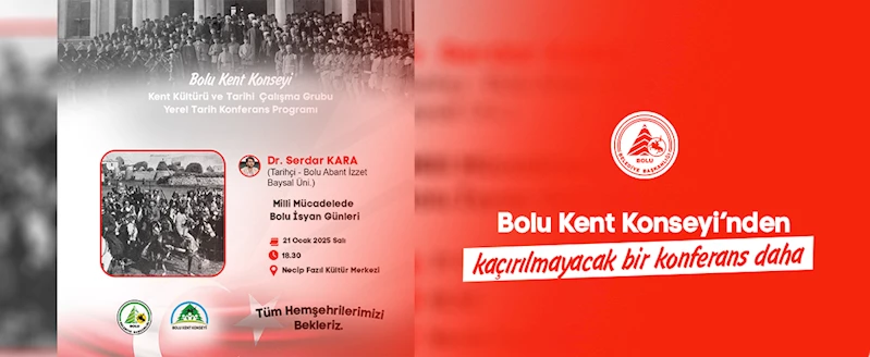 Bu kapsamda, 21 Ocak 2025 Salı günü (yarın), Tarihçi Dr. Serdar Kaya tarafından “Millî Mücadelede Bolu İsyan Günleri” konulu bir konferans verilecek. Dr. Kaya, konferansta Millî Mücadele döneminde Bolu’da yaşanan isyan günlerini detaylı bir şekilde ele alacak.