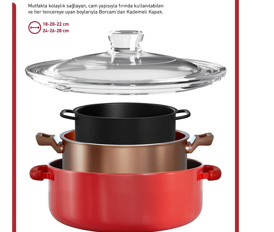 Yıllardır tüketicilerin gönlüne taht kurmuş bir efsane olan ve geniş ürün gamıyla dikkat çeken Borcam’ın yeni inovatif ürünü Borcam Kademeli Kapak, iki farklı boy seçeneğiyle tüm tencere ve tavalara uyumlu olacak şekilde kademeli olarak tasarlandı. Özel yükseltisi sayesinde buhar çıkışı sağlarken hem fırında hem de ocak üstünde kullanılabilen bu kapakla mutfaklarda yer tasarrufu sağlamanın yanı sıra yemek pişirmek çok daha keyifli.