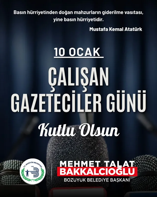 Bozüyük Belediye Başkanı Mehmet Talat Bakkalcıoğlu, 10 Ocak Çalışan Gazeteciler Günü dolayısıyla bir kutlama mesajı yayınladı. Mesajında basının demokrasideki rolüne ve gazetecilerin sorumluluklarına değindi.