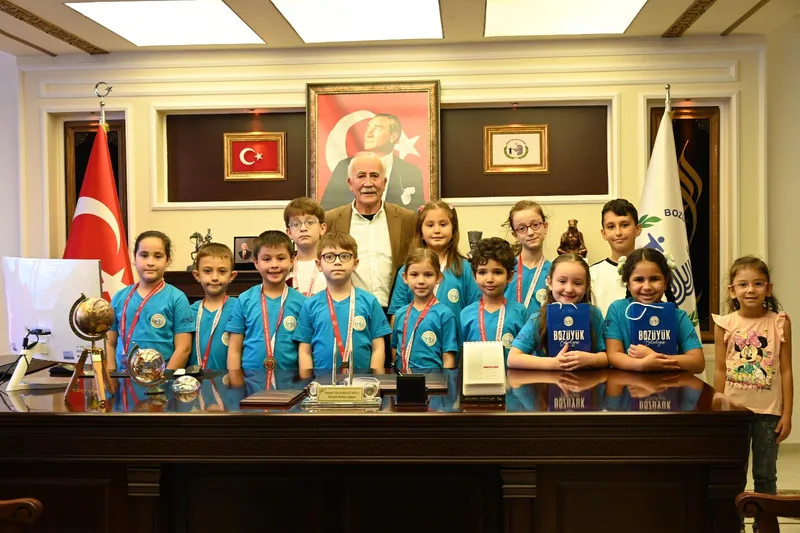 Turnuvadan madalyalarla dönen minik sporcular, ziyaret sırasında mutluluklarını Belediye Başkan Vekili İsmail Özcan ile paylaştı.