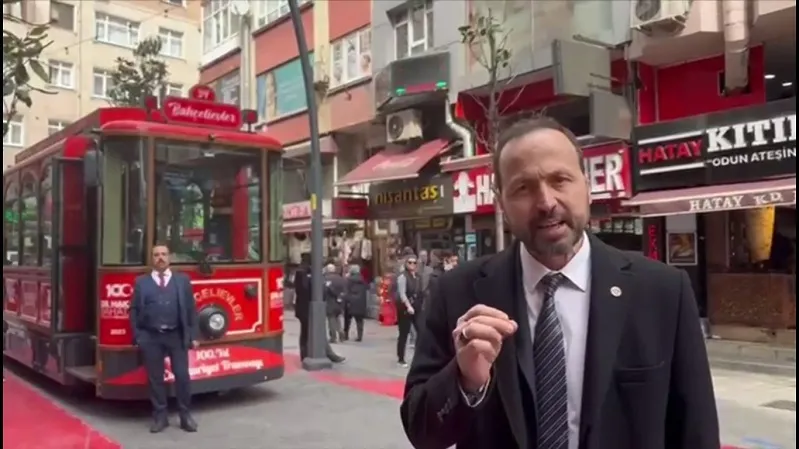 Bağımsız Türkiye Partisi Bahçelievler Belediye Başkan adayı Cavit Özdoğan, bir grup vatandaşla reklam amaçlı kullanılan tramvayın önünde basın açıklaması yaptı.