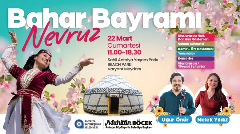 Antalya Büyükşehir Belediyesi, Bahar Bayramı Nevruz’u 22 Mart Cumartesi günü Beach Park Varyant Meydanı’nda 11.00 - 18.00 saatleri arasında gerçekleştirilecek bir dizi etkinlikle kutlayacak. Baharın müjdecisi Nevruz kutlaması, saygı duruşu ve İstiklal Marşı’nın okunmasından sonra Nevruz duasıyla başlayacak. Halk oyunları, uluslararası dans gösterileri, semah gösterisi, demir-örs dövülmesi, ateşten atlama, yöresel sunumlar ve konserler gerçekleştirilecek.