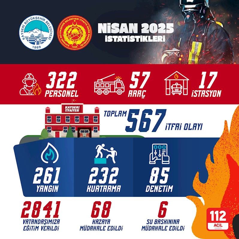 Nisan ayı verilerine göre 261 yangın, 68 trafik kazası ve 6 su baskınına müdahale eden ekipler, 232 de kurtarma çalışması yaptı. Öte yandan Büyükşehir Belediyesi İtfaiye Daire Başkanlığı ekipleri, 2 bin 841 vatandaşa eğitim verirken 85 de denetim yaptı.