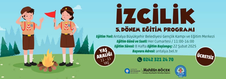 Antalya Büyükşehir Belediyesi tarafından geleceğin izcilerinin yetiştirilmesi için 11-15 yaş arasındaki genç ve çocuklara yönelik düzenlenen 5. Dönem İzcilik Eğitim Programına başvurular başladı. İzcilik faaliyetleri 22 Şubat tarihinde başlayacak.