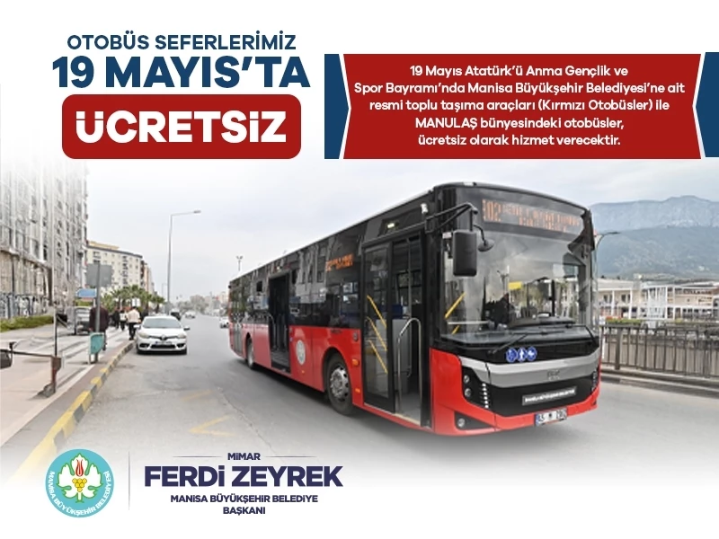 Manisa Büyükşehir Belediyesi, 19 Mayıs Atatürk'ü Anma, Gençlik ve Spor Bayramı’nda Manisalılara ücretsiz toplu taşıma hizmeti sunacak. Manisa Büyükşehir Belediyesi’ne ait resmi toplu taşıma araçları (Kırmızı Otobüsler) ile MANULAŞ bünyesindeki otobüsler, gün boyunca vatandaşları ücretsiz taşıyacak.