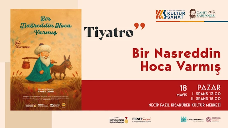 Büyükşehir Belediyesi, Sahne Maraş Tiyatro Okulu tarafından sahneye taşınacak “Bir Nasrettin Hoca Varmış” adlı tiyatro oyununu 18 Mayıs Pazar günü NFK Kültür Merkezi’nde minik izleyicilerle buluşturacak.