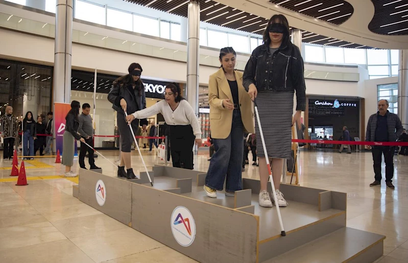 Kabartmalı sarı çizgi ve platformun yer aldığı ve ‘Bir an dur anla, empati kur’ sloganıyla kurulan parkurun hemen yanında, özel gereksinimli yurttaşlara nasıl yardımcı olunabileceğini gösteren görseller de sergilendi.