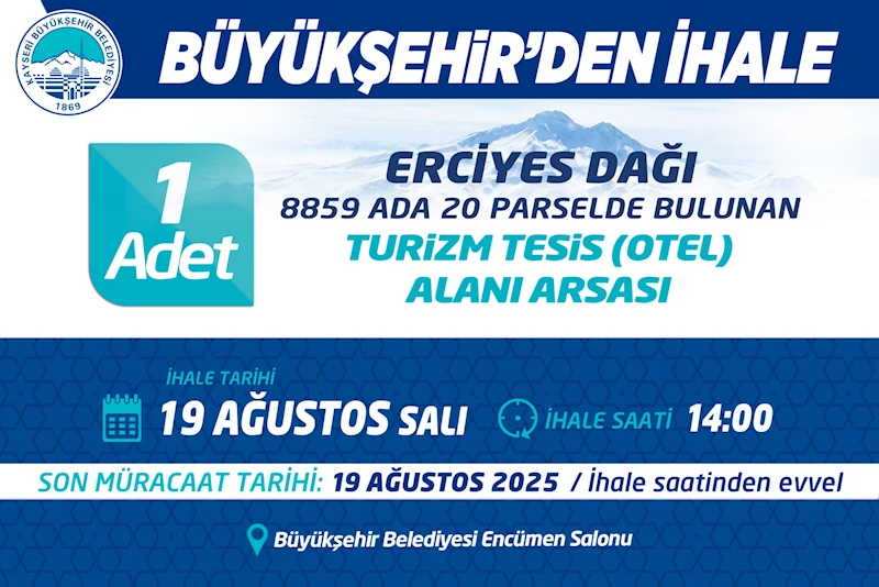 Melikgazi ilçesi Erciyes Mahallesi’nde bulunan turizm tesis alanı (otel) arsası ihalesi, 19 Ağustos 2025 Salı günü saat 14.00’te gerçekleştirilecek.